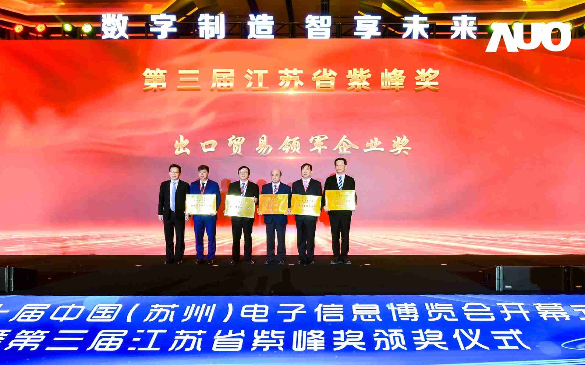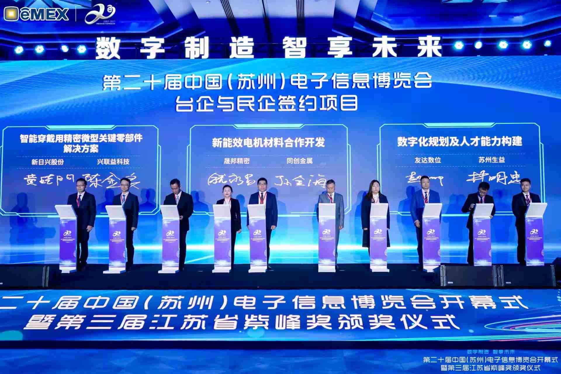 电博会开幕式当天也是第三届江苏省紫峰奖颁奖仪式,,,省台办、、、、工信厅、、、商务厅、、、苏州市相关领导均出席并颁奖。。该奖项为表彰对江苏高质量发展做出积极贡献的在苏企业,,,,由江苏省政府专门设立。。。。尊龙z6光电 (苏州) 总经理郭振明代表上台领奖,,,,这也是尊龙z6苏州连续三次蝉联紫峰奖 出口贸易领军企业奖。。尊龙z6数位总经理赵丽娜女士,,,,也参与本次开幕式,,上台为本地化赋能签署战略合作协议,,将优质服务资源集合、、、、下沉到更多细分行业,,,,为更多地区的制造企业提供数字化转型服务。。。