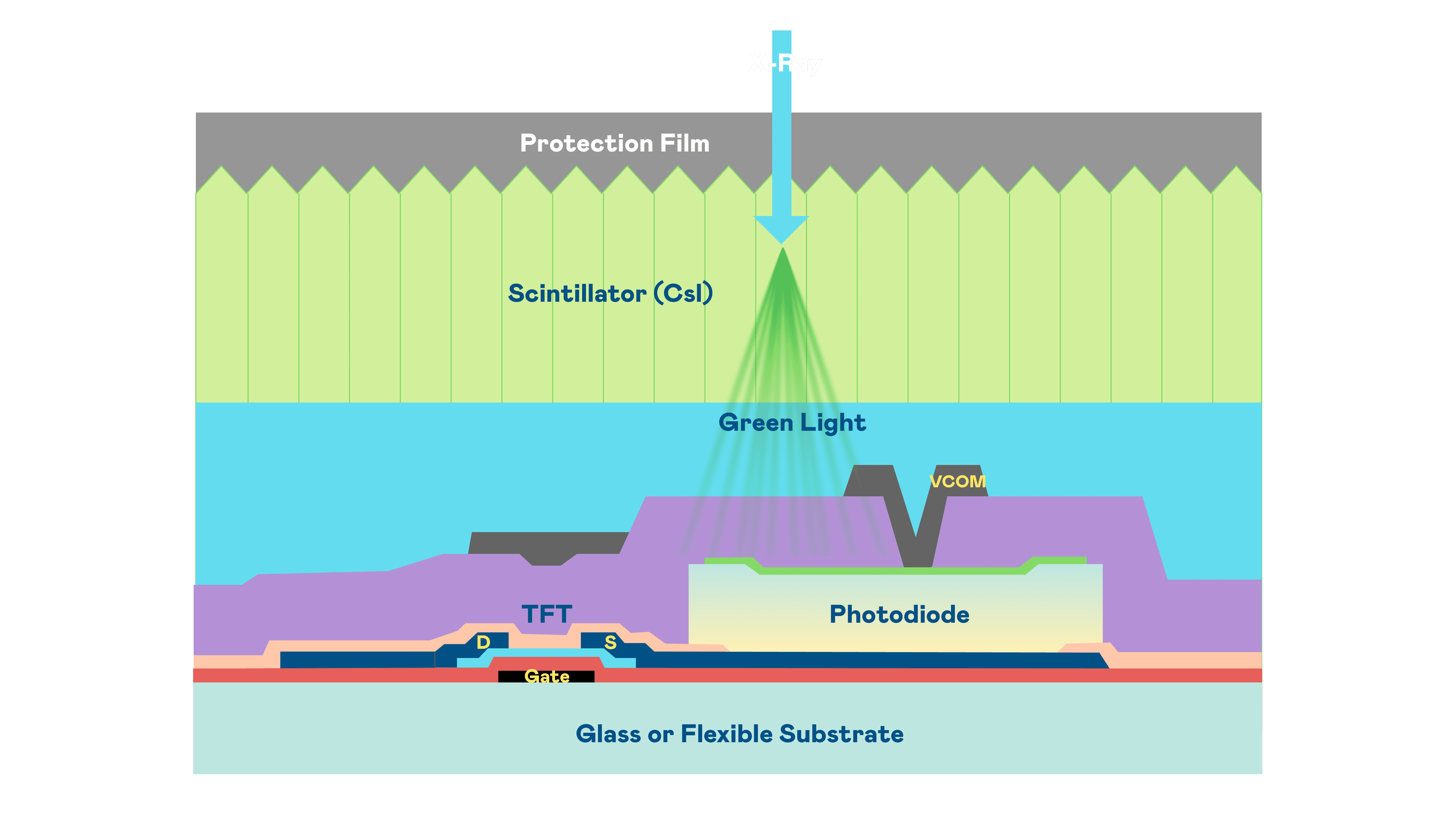 尊龙z6的X光影像感测阵列使用薄膜电晶体 (TFT) 作为每个像素的读取开关,,,搭配光电二极体(Photodiode)的光电转换元件,,用以感测X光影像讯号。。
